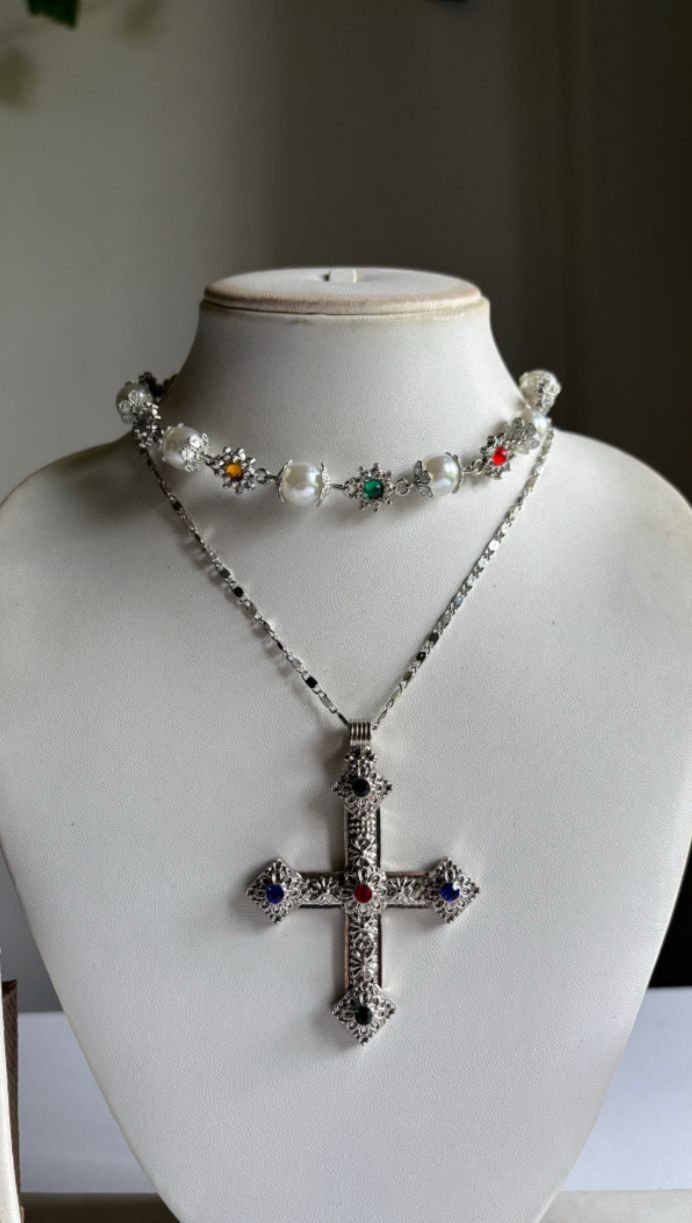 A timeless silver pearl necklace featuring a delicate cross pendant. Perfect for adding a touch of elegance and faith to any outfit. Lightweight, adjustable, and crafted with high-quality materials for everyday wear.